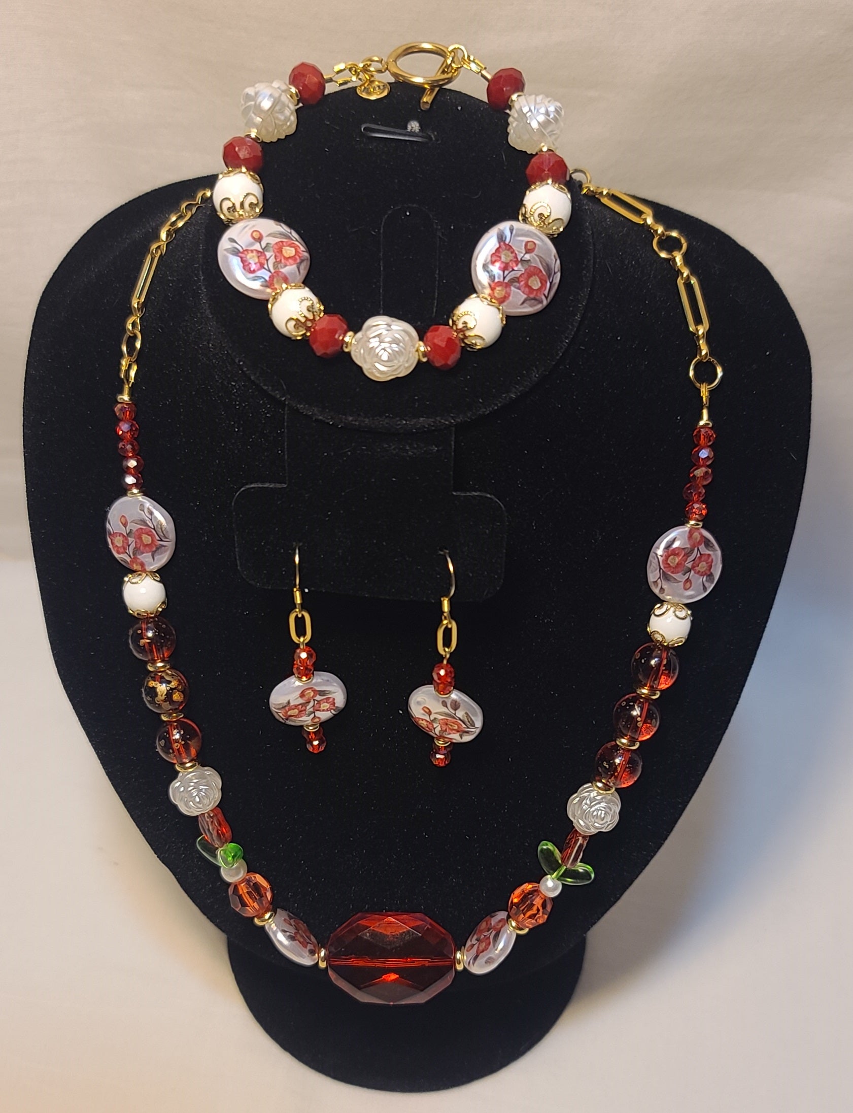 Celebration of Red Acrylic Gem & Floral Bead Necklace, Bracelet & Earrings Set Gold Stainless Steel