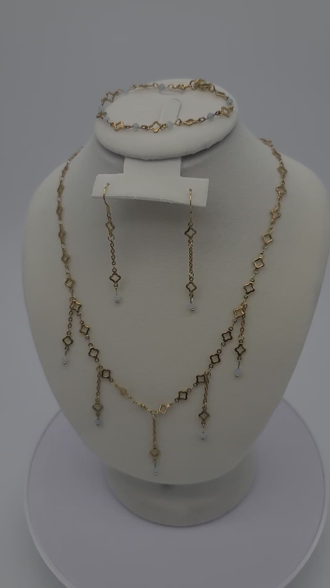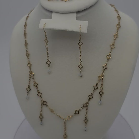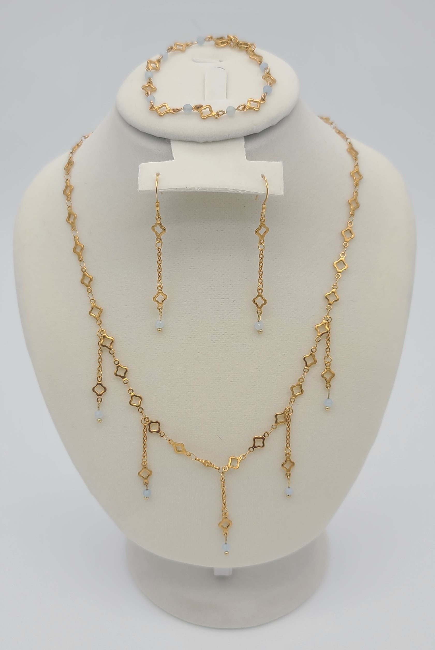 Aquamarine & Gold Clover Jewelry Set, Adjustable, Fringe Necklace, Bracelet & Earrings