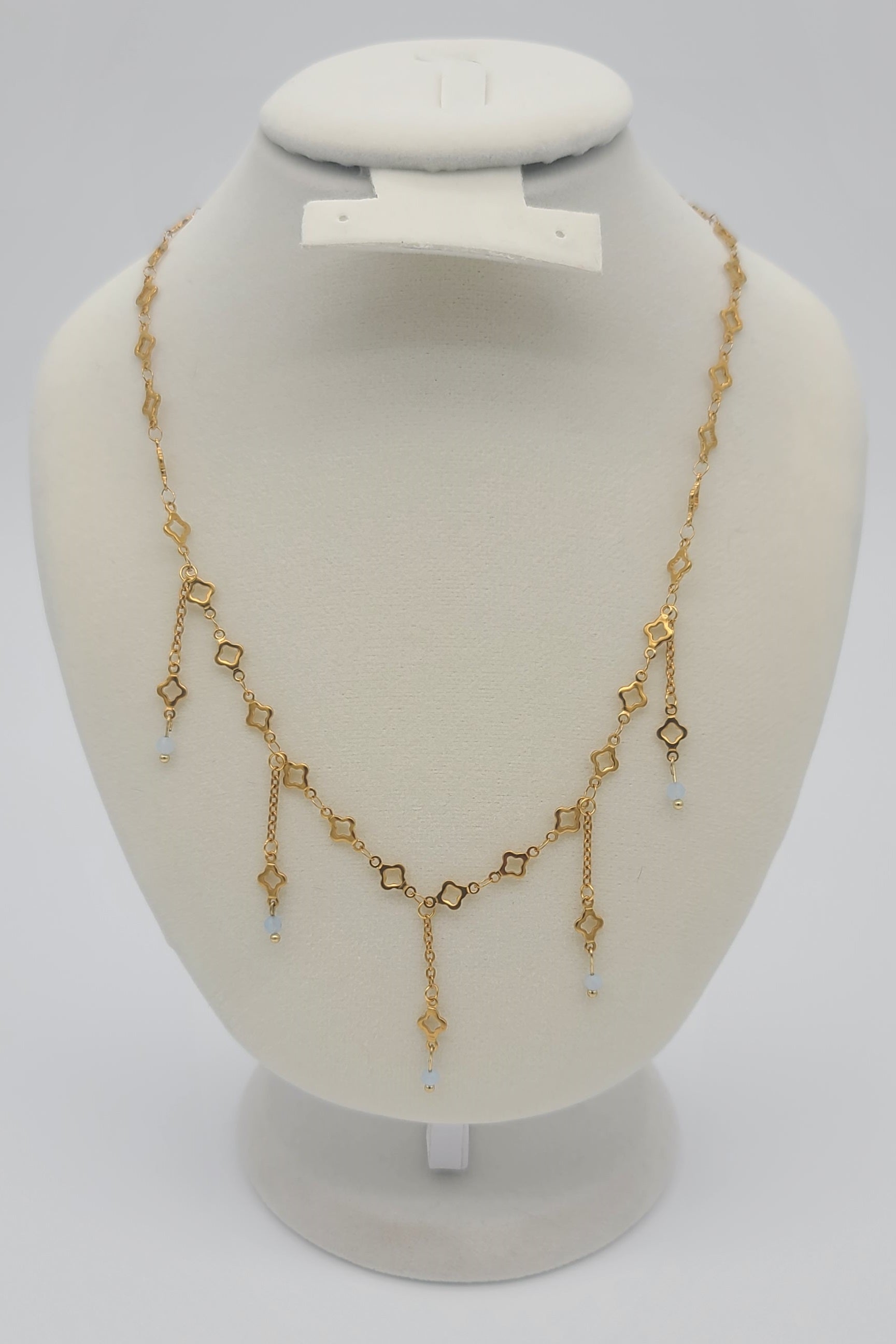 Inspired by creating handmade chains especially with the uniqueness of the pale blue aquamarine paired with the modern clover design.