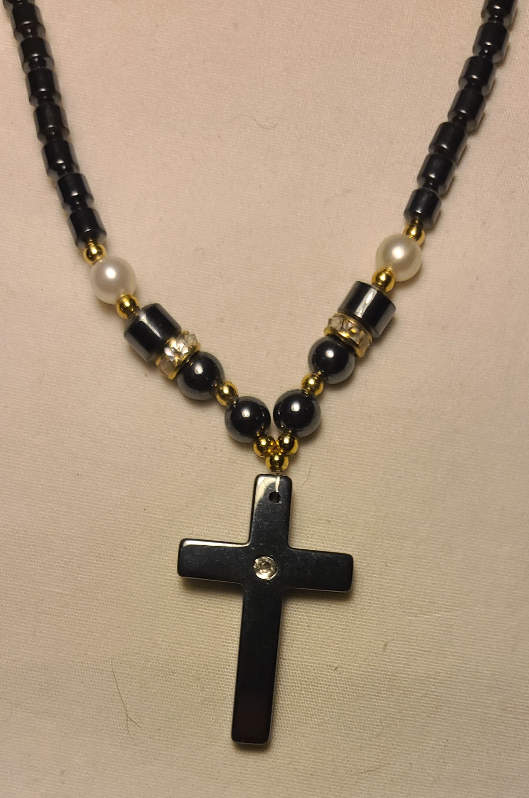 Hematite Cross Necklace with Gold-Tone & Pearl Accents