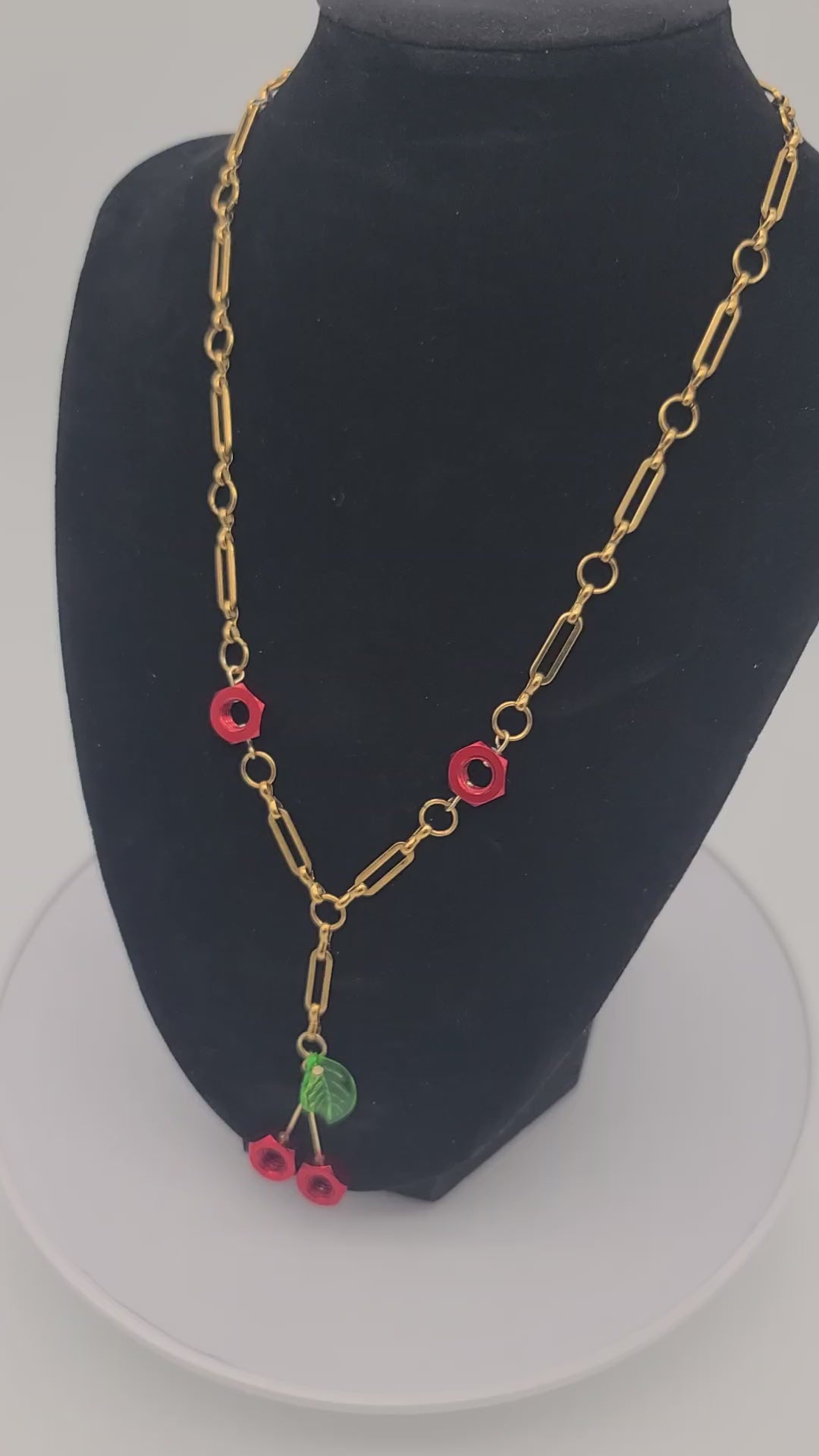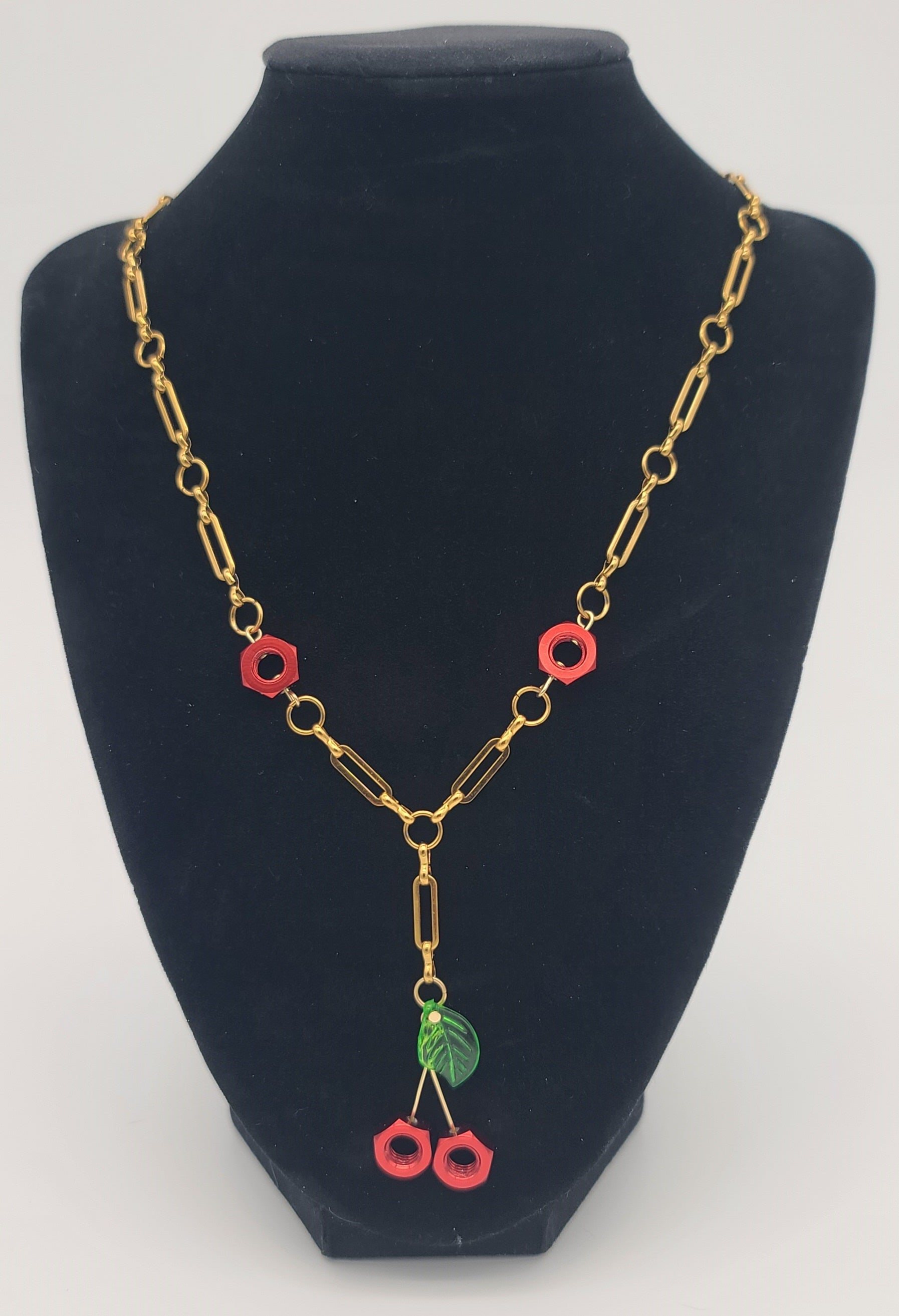 Featuring red aluminum hex nuts and glossy green acrylic leaves on luxe gold stainless steel, this handcrafted trio captures cottage-core cuteness with a unique industrial twist.