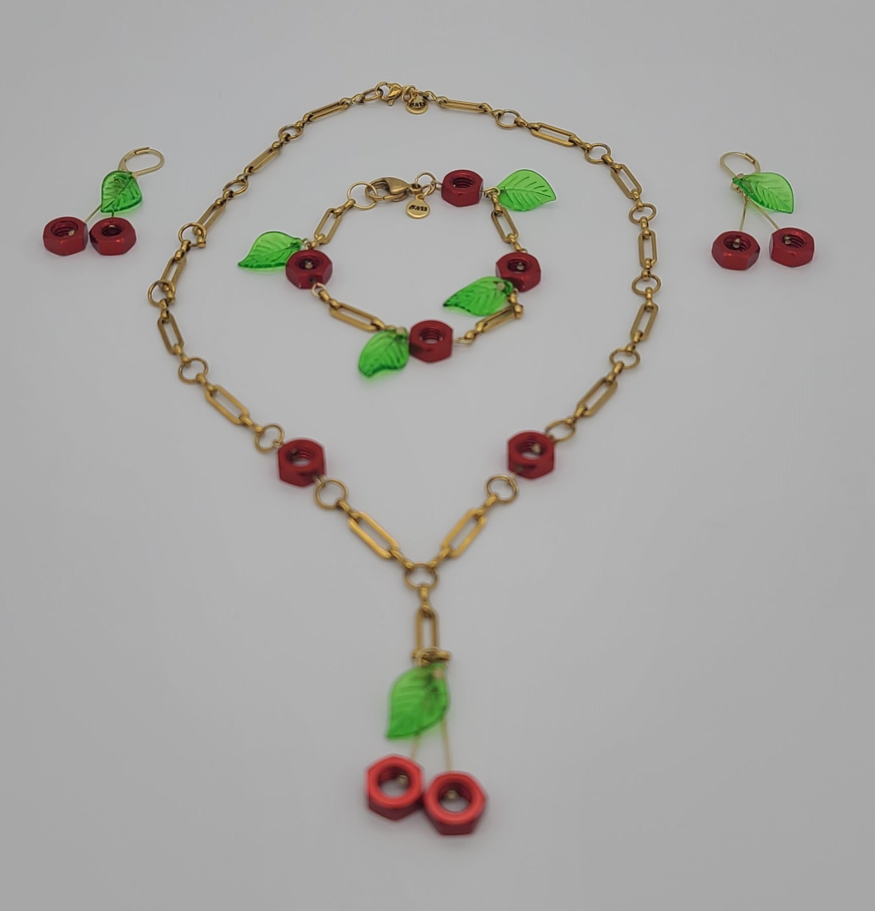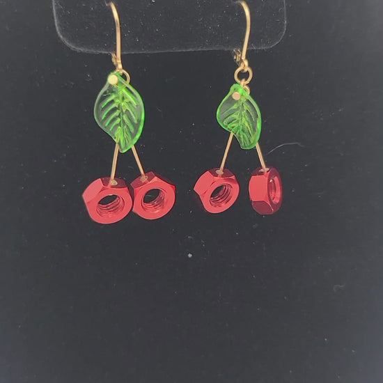 Featuring red aluminum hex nuts and glossy green acrylic leaves on luxe gold stainless steel, this handcrafted trio captures cottage-core cuteness with a unique industrial twist.