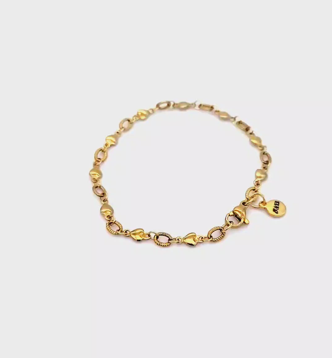 This bracelet combines polished hearts and textured ovals in shining gold stainless steel.