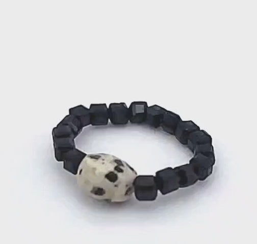 This stretch ring pairs black spinel cube beads with a bold Dalmatian jasper focal stone.