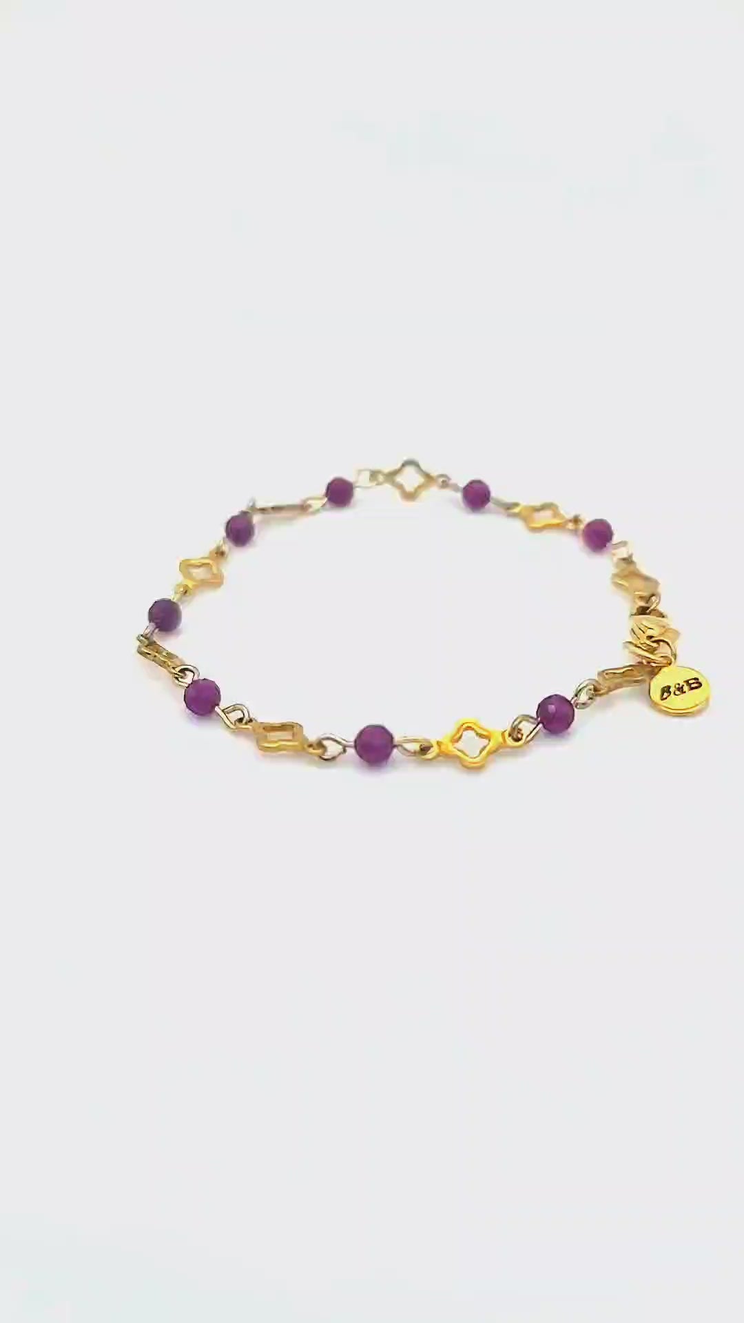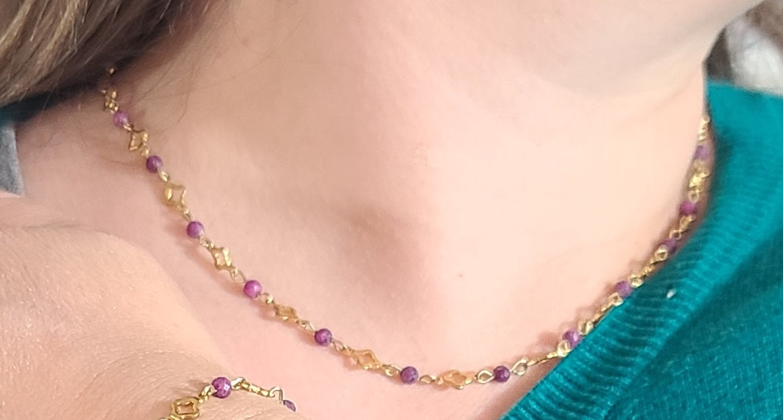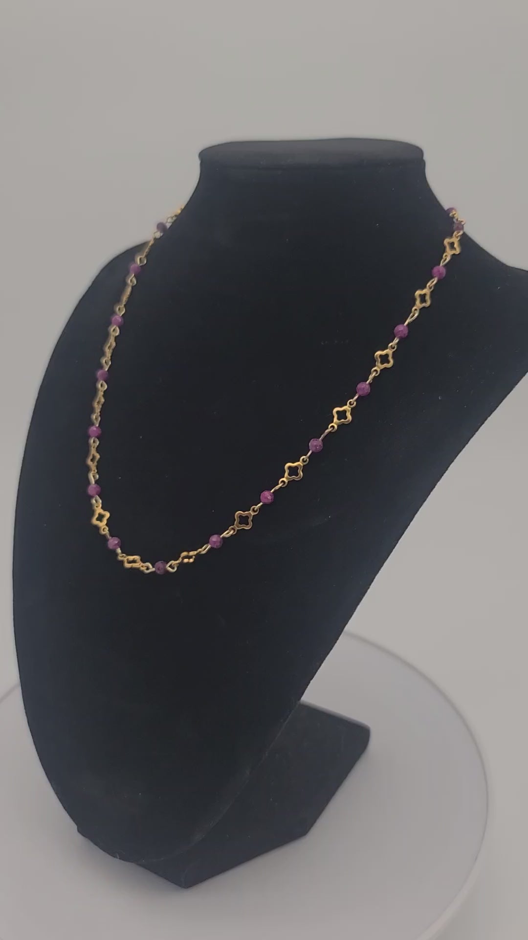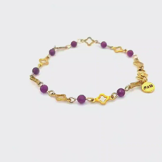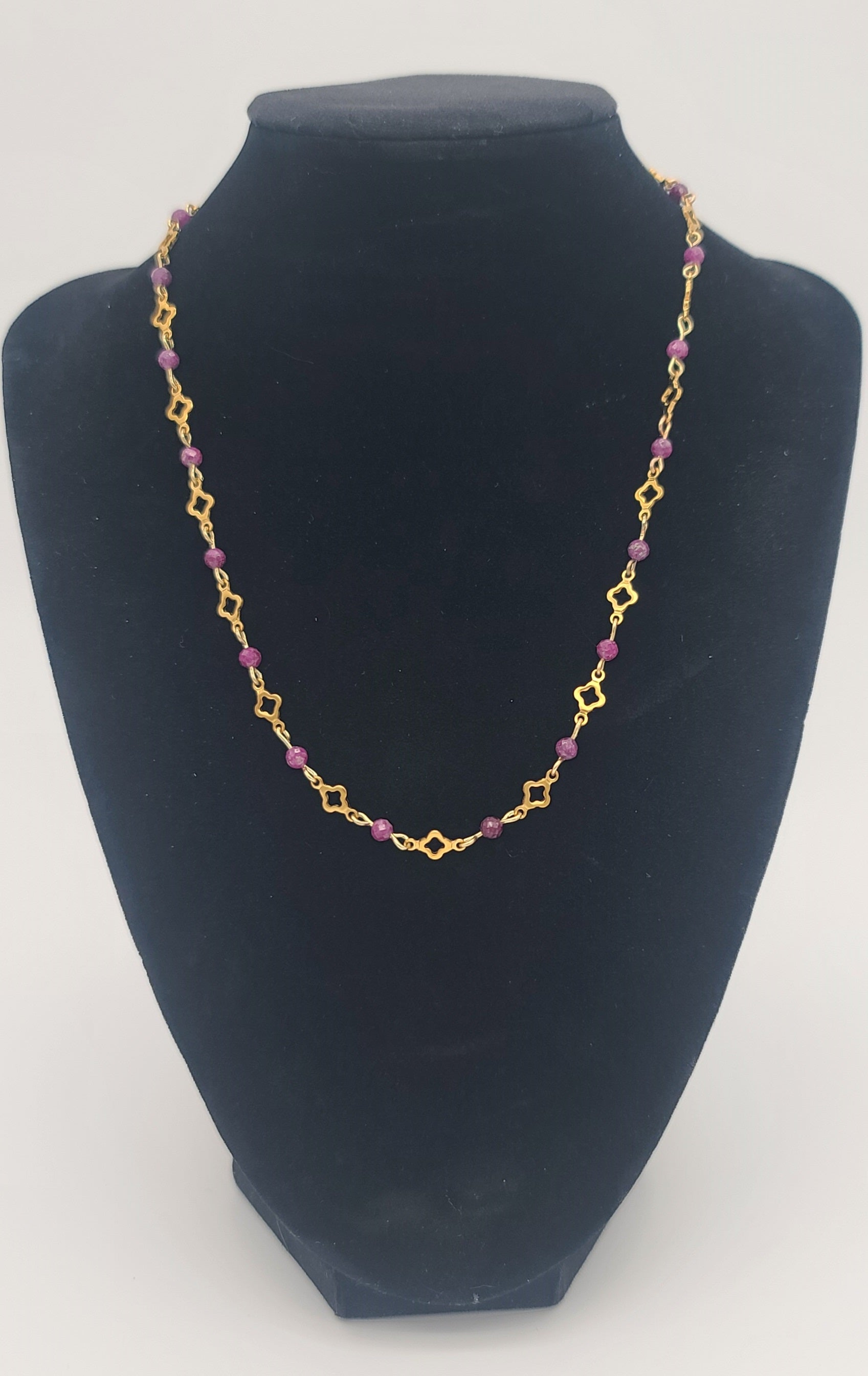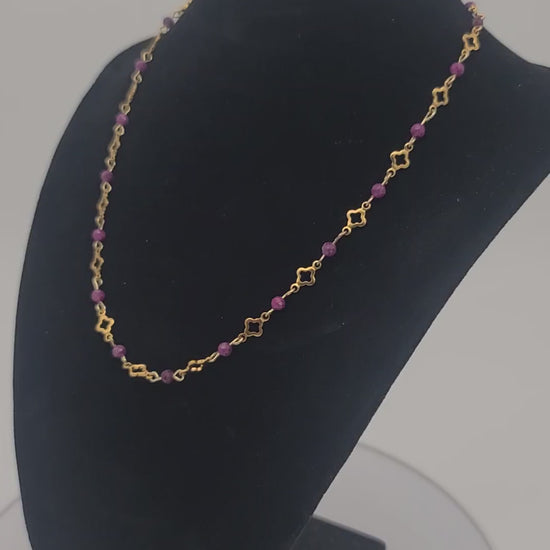 Materials: Polished gold stainless steel with open clover links and 4mm natural ruby gemstone beads