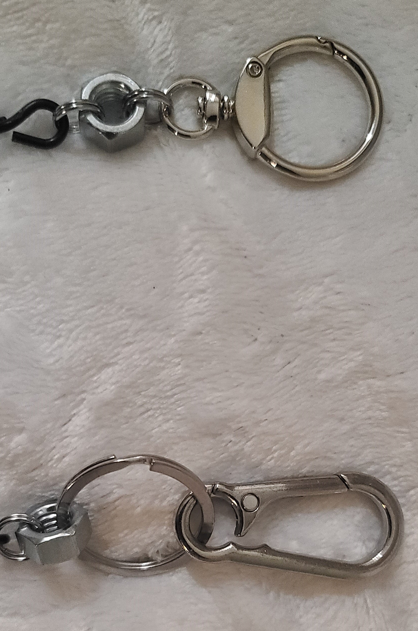 This handmade wallet chain features a unique design using 5/16 inch zinc hex nuts #10 zinc washers & black steel chain links joined with 10 mm stainless steel jump rings, with a stainless steel carabiner belt clip and a round carabiner wallet clip.